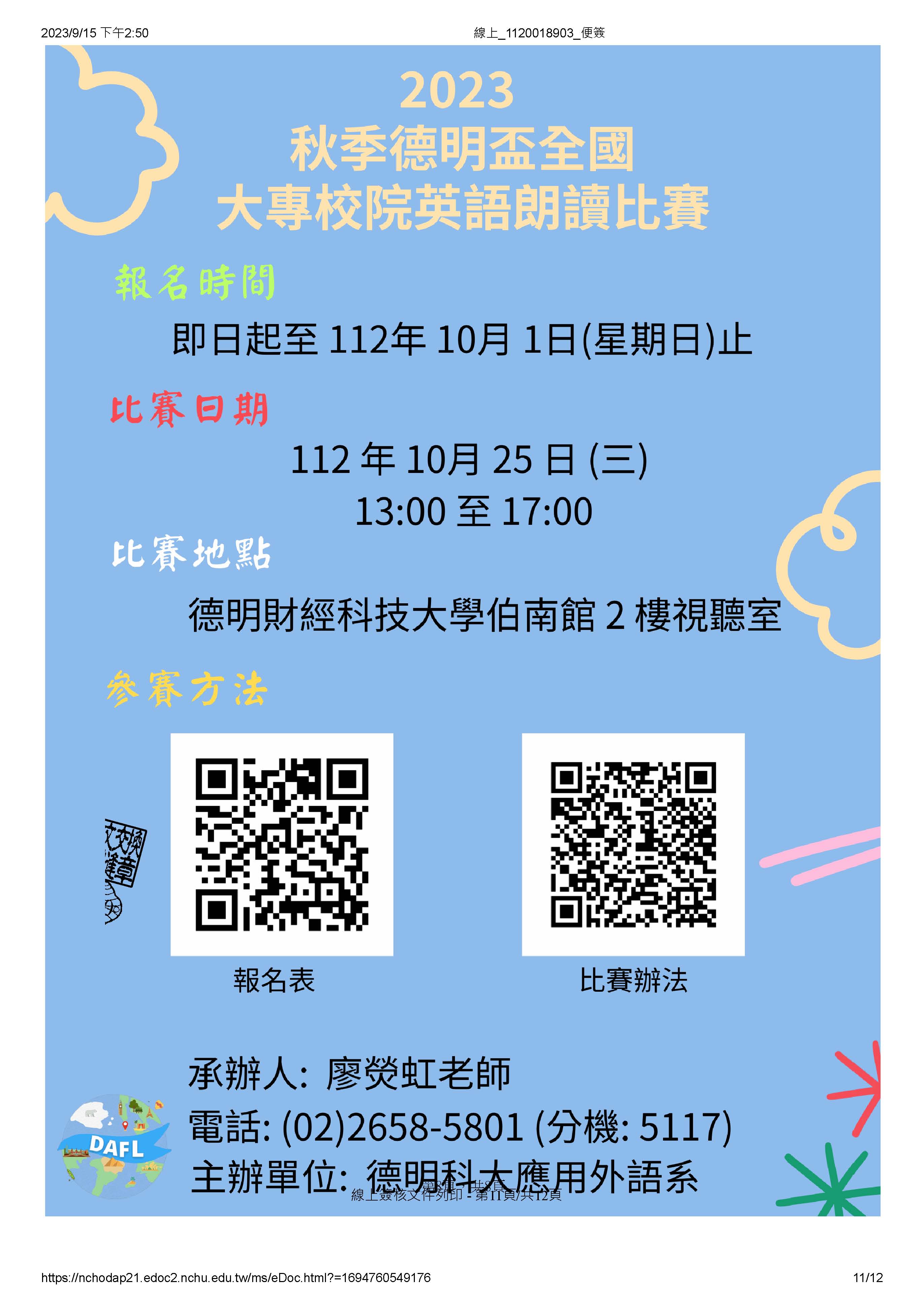 2023秋季德明盃全國大專校院英語朗讀比賽