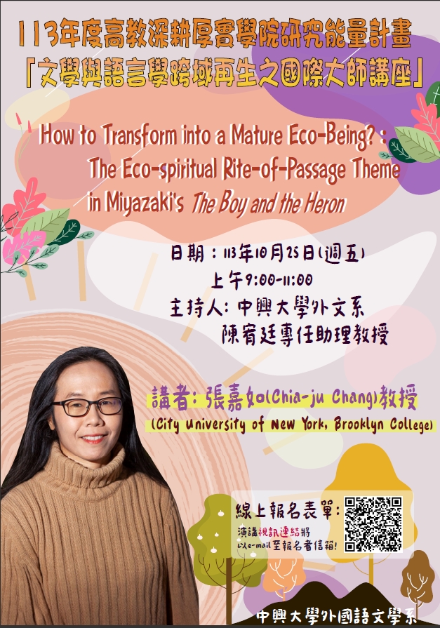 講題: How to Transform into a Mature Eco-Being? : The Eco-spiritual Rite-of-Passage Theme in Miyazaki's The Boy and the Heron